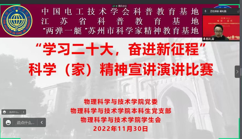 为学习宣传贯彻党的二十大精神,充分发挥黄色影片 中国电工技术学会科普教育基地、江苏省科普教育基地、苏州市科学家精神教育基地的引领带动作用,弘扬科学家精神、讲好科学家故事。11月30日下午,黄色影片 党委通过线上腾讯会议的形式开展了“学习二十大,奋进新征程”——科学(家)精神演讲比赛。学院全体党政领导、全体辅导员老师担任评委嘉宾,学院全体2022级本科生观摩了此次比赛。比赛由学院辅导员郭永坤主持。