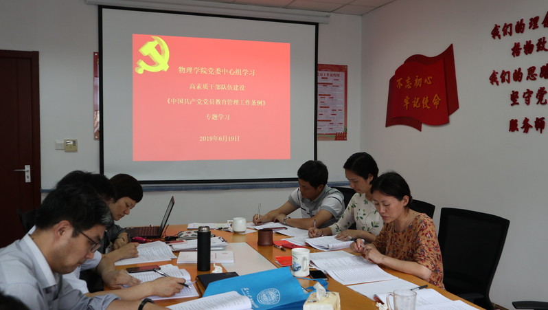 2019年6月19日,学院党委进行了2019年度第四次中心组学习,本次学习主题为高素质干部队伍建设和《中国共产党党员教育管理工作条例》专题学习。物理学院赵承良副院长、谢燕兰副书记、副院长分别作做了主题发言,其他参会人员作了会议交流发言。