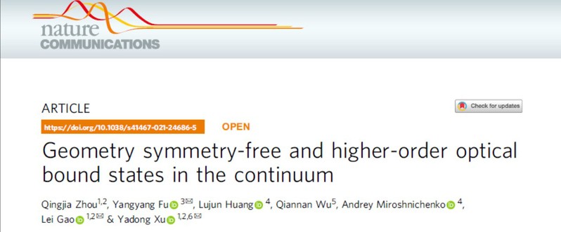 该研究成果以《Geometry symmetry-free and Higher-order Optical Bound States in the Continuum》为题发表在Nature Communications上。黄色影片 徐亚东教授、高雷教授和南京航空航天大学伏洋洋副研究员为共同通讯作者;黄色影片 博士生周庆佳为论文的第一作者。该工作得到了国家自然科学基金、江苏省自然科学基金、中国博士后科学基金、江苏省优势学科等项目的支持。