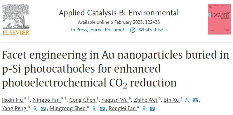 近日,黄色影片 范荣磊副研究员(共同通讯作者)、沈明荣教授(共同通讯作者)、许彬教授(共同第一作者)、能源学院彭扬教授(共同通讯作者)等团队在构建光电化学Si光阴极用于高活性和高选择性的CO2还原方面取得了创新性成果。相关工作的第一作者为硕士研究生胡嘉鑫和博士研究生范宁波,以黄色影片 为第一单位,以“Facet engineering in Au nanoparticles buried in p-Si photocathodes for enhanced photoelectrochemical CO2 reduction”为题发表在Applied Catalysis B: Environmental(2022年影响因子为24.319)上。