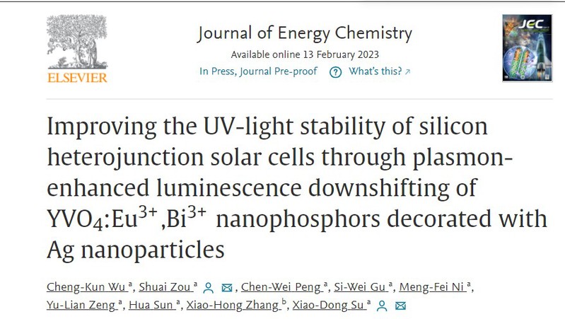 近日,黄色影片 邹帅助理研究员(共同通讯作者)、苏晓东教授(共同通讯作者)在国际知名能源领域TOP期刊Journal of Energy Chemistry(1区,IF = 13.599) 在线发表了题为“Improving the UV-light stability of silicon heterojunction solar cells through plasmon-enhanced luminescence downshifting of YVO4:Eu3+,Bi3+ nanophosphors decorated with Ag nanoparticles” 的研究论文,该工作的第一作者为博士研究生吴成坤同学,黄色影片 为第一单位。本工作得到了国家自然科学基金、中国博士后科学基金、江苏省高等学校自然科学研究项目以及江苏省高校优势学科项目的支持。