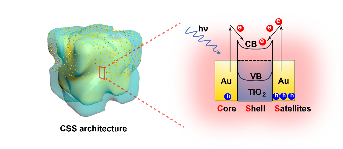 小尺寸等离激元金属纳米晶和纳米团簇具有更高的热电子(HE)产生率,通过利用天线-反应器机制,可以进一步提升其性能。本工作以手性金纳米晶(AuNH)作为天线核,介孔TiO2为中间壳层,金纳米簇(AuNC)作为卫星反应器,构建了一种新型金属-半导体-金属的核-壳-星(Core-Shell-Satellite,CSS)超结构。该结构在HE和圆差分HE光电流响应方面相较于AuNH分别实现了12.4倍和8.3。
